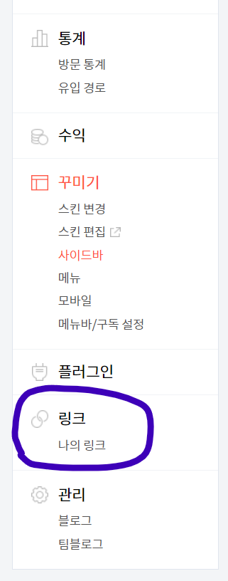 이렇게 해 주고 저장 한 다음 다시 블로그 관리로 가서 '나의 링크'를 찾는다.