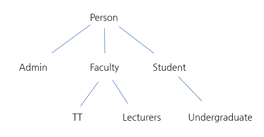 위 그림과 같이 대학 구성원의 계층 구조를 그려보면, Undergraduate과 Student는 Person에 속하지만 Faculty와 Admin에 대해서는 알지 못한다. 즉 트리를 올라갈 수만 있다.