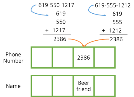 긴 숫자를 작은 숫자로 분해하고, 작은 숫자들의 합을 구한다. 아래와 같이 해시 충돌이 발생할 수 있다.