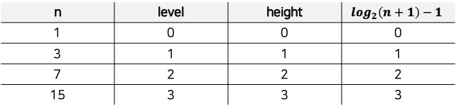 height(높이) : 루트에서부터 가장 먼 잎까지 가는데 거치게 되는 간선의 개수 = log2(n+1)−1