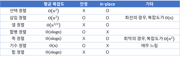 - 삽입 정렬: 요소를 하나씩 꺼내서 요소 앞에 있는 것들과 비교하며 알맞은 위치에 삽입하는 방법 (이미 정렬된 경우에 유용, O(n))