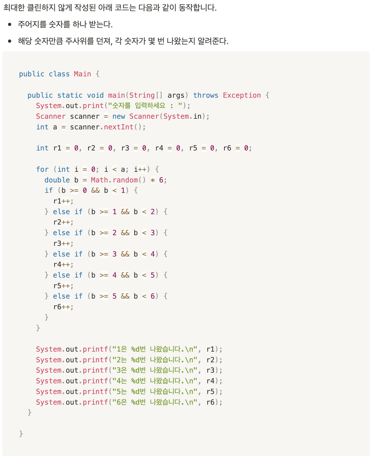 - math.random() 대신에 random.nextInt()로 난수로 정수를 생성해 더 주사위다운 코드로 만들기