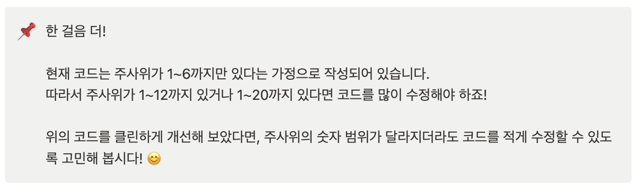 - 주사위 면체를 상수로 지정해 DICE_SIZE만 변경하여 재사용 가능하게